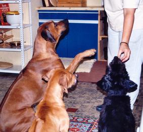 In jedem Fall bedarf es aber der Kommunikation, d. h. es muss einen Sender und einen Empfänger geben. Hunde sind wahre Kommunikationskünstler - sowohl innerartlich als auch bezüglich der Verständigung zwischen Mensch und Hund. Senden WIR also immer die gleichen Signale, stellt der Hund dazu eine besondere Verknüpfung her, z. B. immer nach dem Fressen gibt es noch einen Kauknochen.