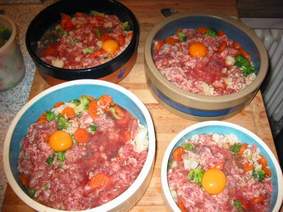 Der Zeitaufwand für selbst zubereitetes Futter ist zwar etwas höher, aber die Hunde werden es einem danken. Außerdem entwickelt man im Laufe der Zeit Praktiken, die die Zubereitung fast zur Nebensache werden lassen: z.B. Huhn in einen Topf mit Wasser geben und kochen, dann das Huhn herausnehmen, in der Brühe nun erst Gemüse garen und dann Nudeln oder Reis darin quellen lassen - fertig! Je nachdem wie viele "Mäuler" man zu stopfen hat, reicht das für 2 - 3 Tage, oder man portioniert es und friert es ein.
