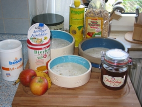 Morgens gibt es Müsli (ohne Zucker), das eine Weile in heißem Wasser gequollen wird. Dazu Obst je nach Saison (Äpfel, Bananen, Erdbeeren, Himbeeren ...), Honig, Bierhefe und im Wechsel Quark, Hüttenkäse oder Joghurt plus einen Schuss Sonnenblumenöl.