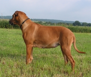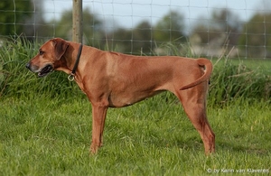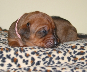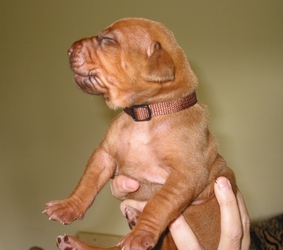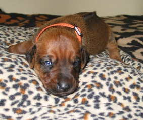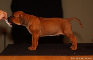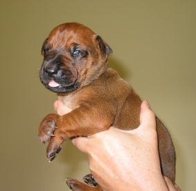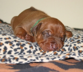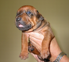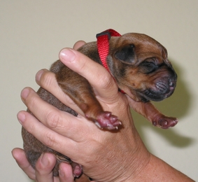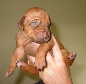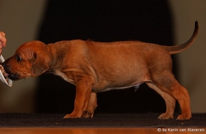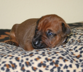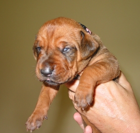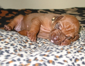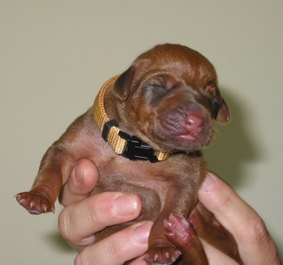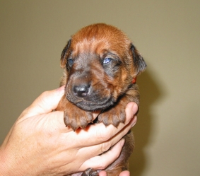 Nr. 1, rot, Hündin, 530 g, korrekter Ridge, Rute ohne Tastbefund, kleiner weißer Brustfleck |