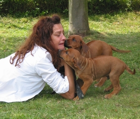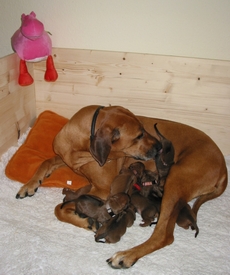 Missie hat am 28. Juni 8 gesunde Welpen zur Welt gebracht. Sie hat sich auf die Geburt sehr ausführlich vorbereitet und die Welpen in kurzen Abständen völlig stressfrei geboren. Missie hat alle ihre Aufgaben, wie z. B. Abnabeln usw. sehr instinktsicher gemeistert.