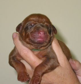 Nr. 2, braun, Hündin, 565 g, livernose, korrekter Ridge, Rute ohne Tastbefund |
