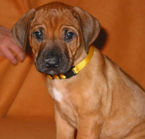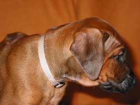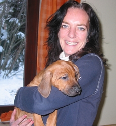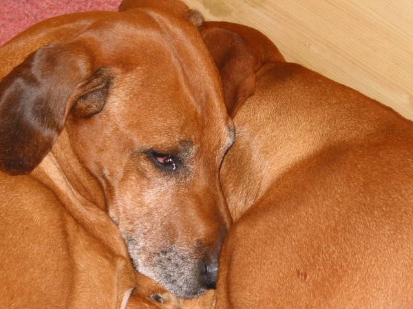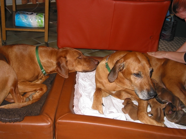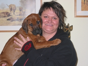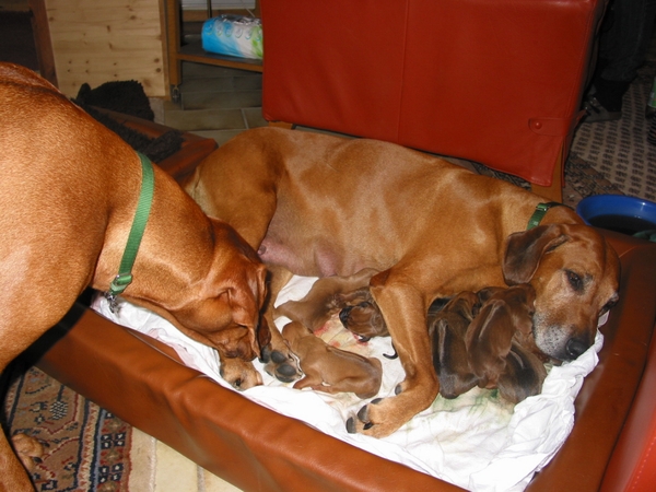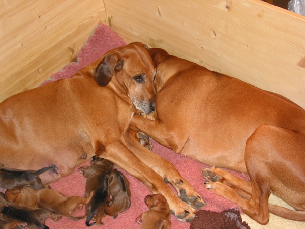 Glenda (Frau Rot) hat eine weite Reise zu Monika Ermer und Ortwin Kellerbauer nach Eching bei München angetreten und sich schon mit Ridgeback-Rüde Otayo angefreundet...