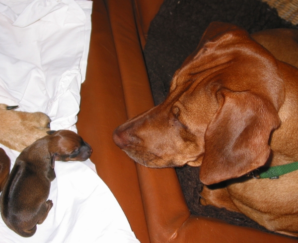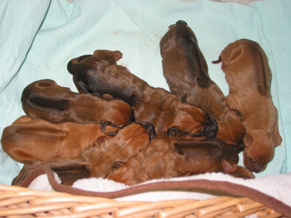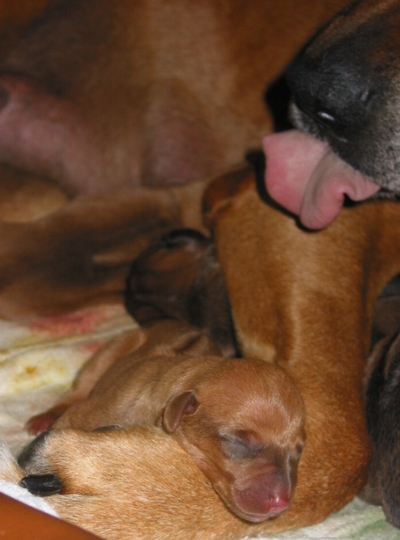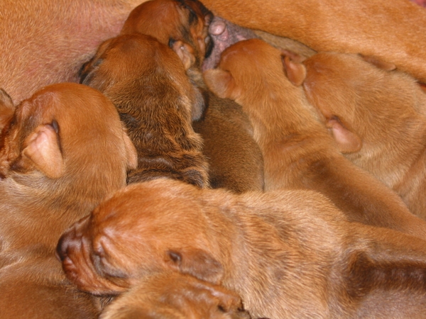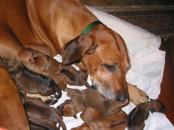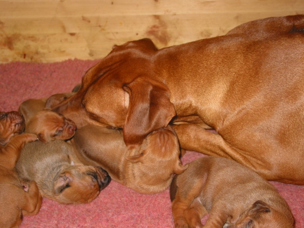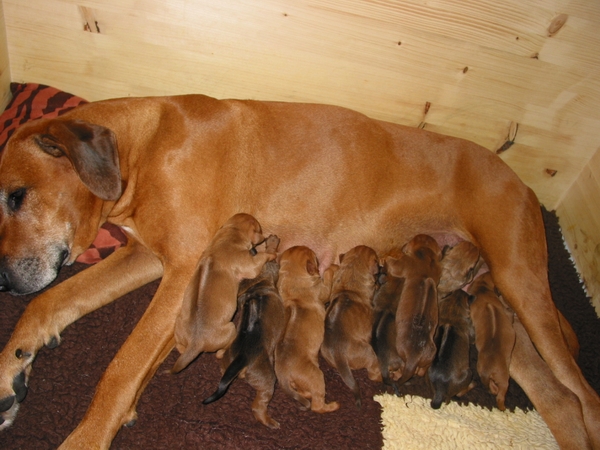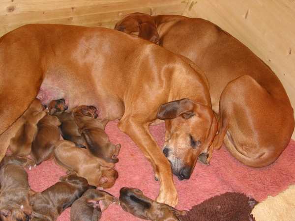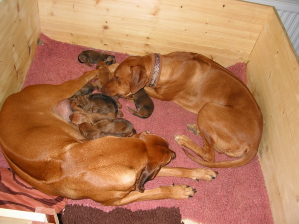 Missie hat am 09.11.2009 zehn putzmuntere Welpen zur Welt gebracht. Sie hat ihre Sache wie erwartet ausgezeichnet gemacht - diesmal allerdings unter großem Interesse ihrer Tochter Smilla. Es wurden 7 Rüden und 3 Hündinnen geboren, davon 3/2 Livernose. Der Mutter und den Welpen geht es nach der Anstrengung gut. Smilla entwickelt sich zur optimalen Assistentin. Ihr Platz ist inzwischen in der Wurfkiste und sie beteiligt sich rege am Geschehen und unterstützt ihre Mutter bei der Betreuung Welpen.