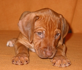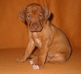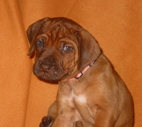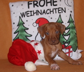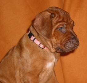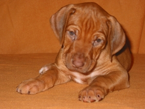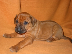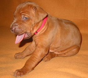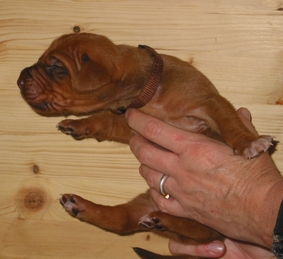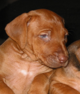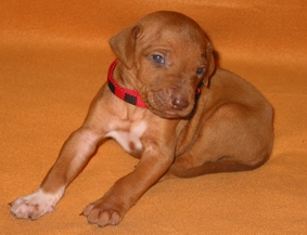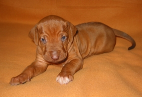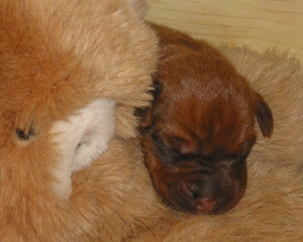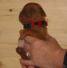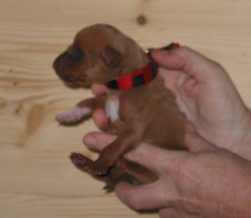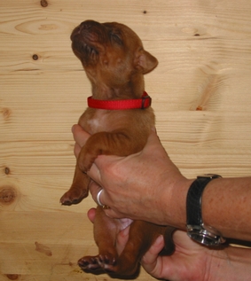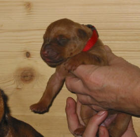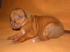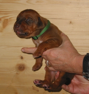 Nr. 5, rot, Hündin, livernose, 540 g, korrekter Ridge, Rute und DS zur Zeit ohne Tastbefund, sehr kleiner weißer Brustfleck |