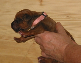 Nr. 7, rosa, Hündin, livernose, 580 g, 3 Crowns, Rute und DS zur Zeit ohne Tastbefund, kleiner weißer Brustfleck |